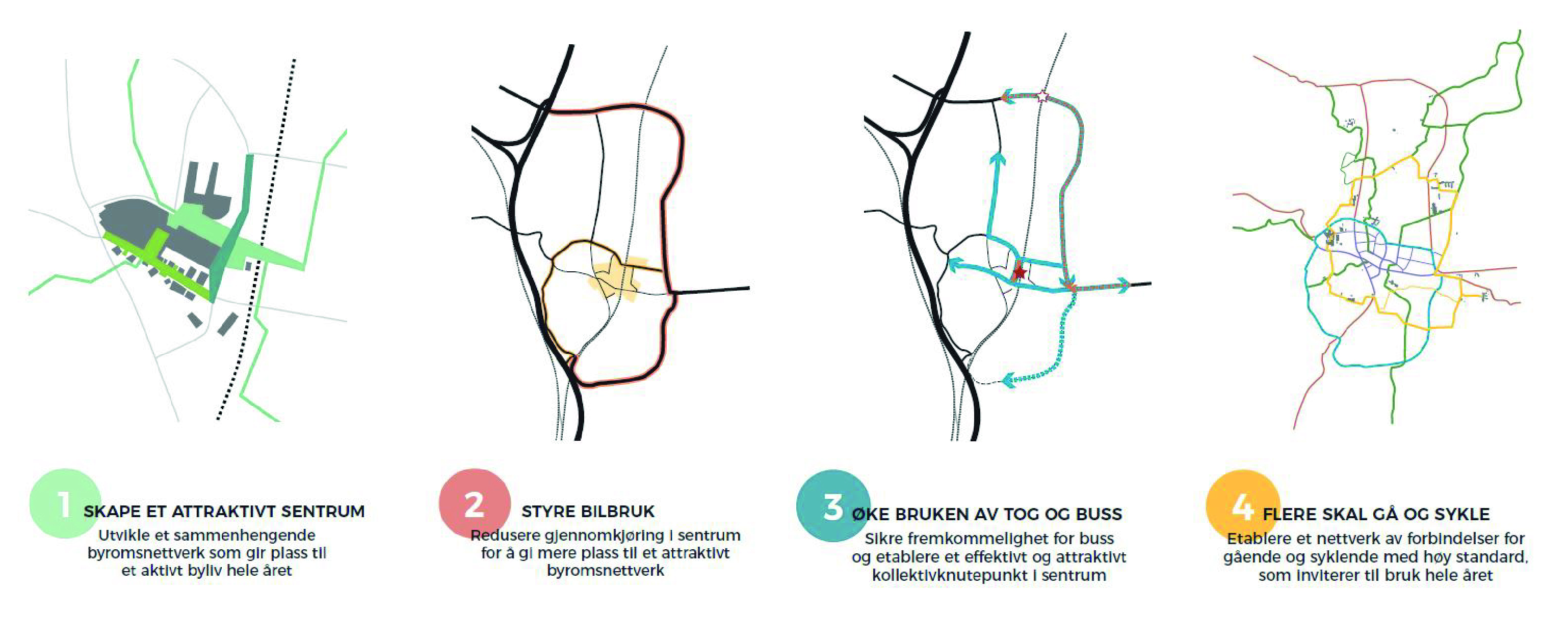 Strategidelen har fire overordnede strategier som skal gi tydelige og styrende rammer i kommende plansaker, mens gjennomføringsprogrammet med handlingsplan vil brukes som et utgangspunkt for videre arbeid med konkrete tiltak som understøtter mobilitets- og byutviklingsstrategien. Klikk på bilde under for se strategiene.