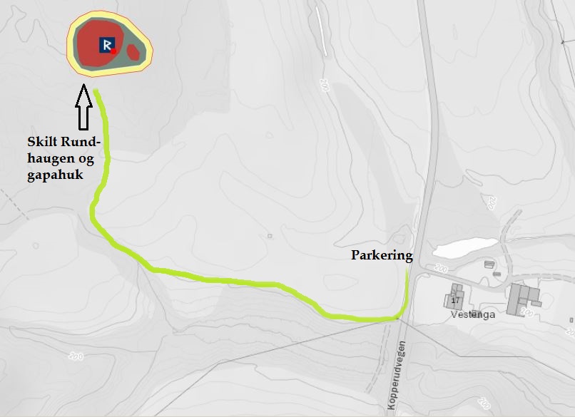 Parkering på jordet ved Vestenga langs Kopperudvegen. Følg jordekanten inn i skogholtet, merket med grønt i kartet.